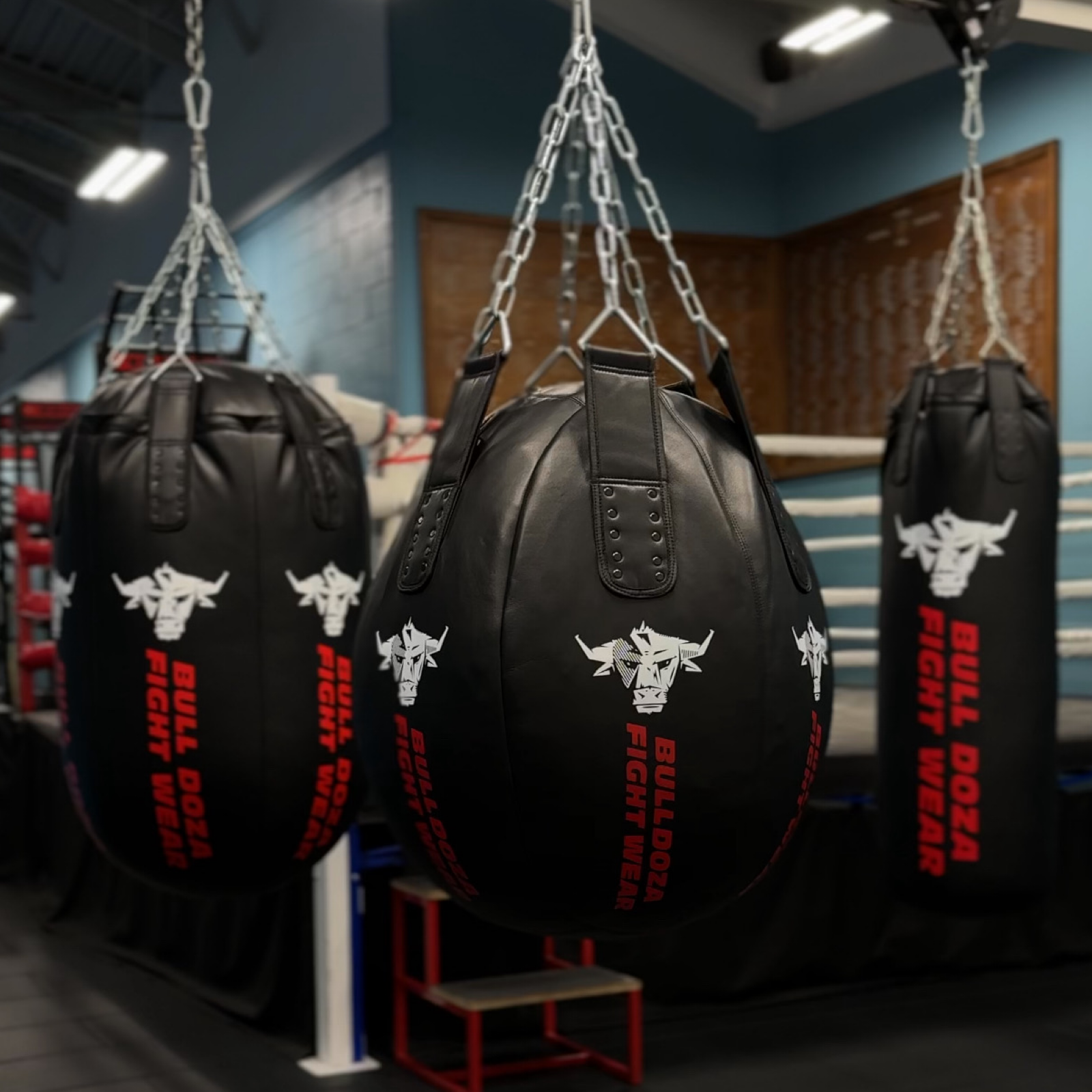 Constructed from six rugged panels each branded with the BULL DOZA FIGHT WEAR logo it features six heavy-duty chain pads, each riveted with ten industrial fasteners. These chain pads hang lower than on conventional bags due to the limited space on a wrecking ball. Originally a structural necessity to preserve durability, this unique setup was unexpectedly embraced by fighters. The low-slung chain pads help dial in head-level targeting, making you pick clean, well-placed shots. It’s now turned into another cool feature of this freakish bag.